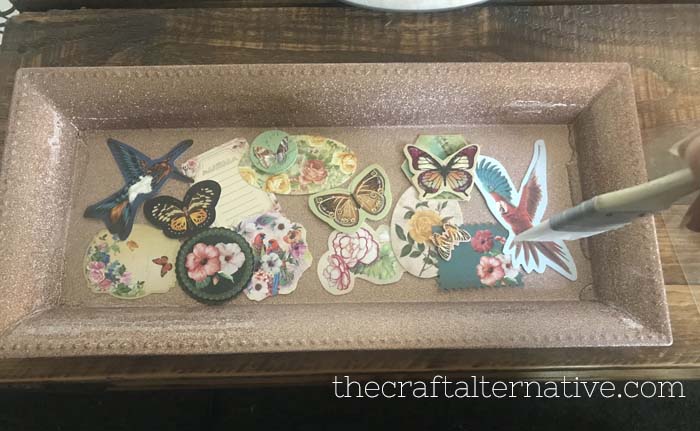 I mixed the resin using a stirring stick until it was clear and there were no bubbles, then I used a paint brush to spread a thin coat of resin over the glitter on the sides of the tray. I poured the rest of the resin in the tray over the stickers.