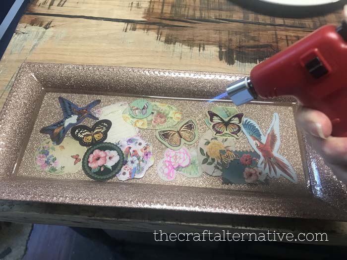 I did notice that the stickers I used did not completely stick to the bottom of the tray so I had to sort of “babysit” the tray until the resin started to harden. As the stickers lifted, I used the stir stick to push them back down, then used the torch to pop any bubbles. Once the resin started to harden, everything stayed in place!